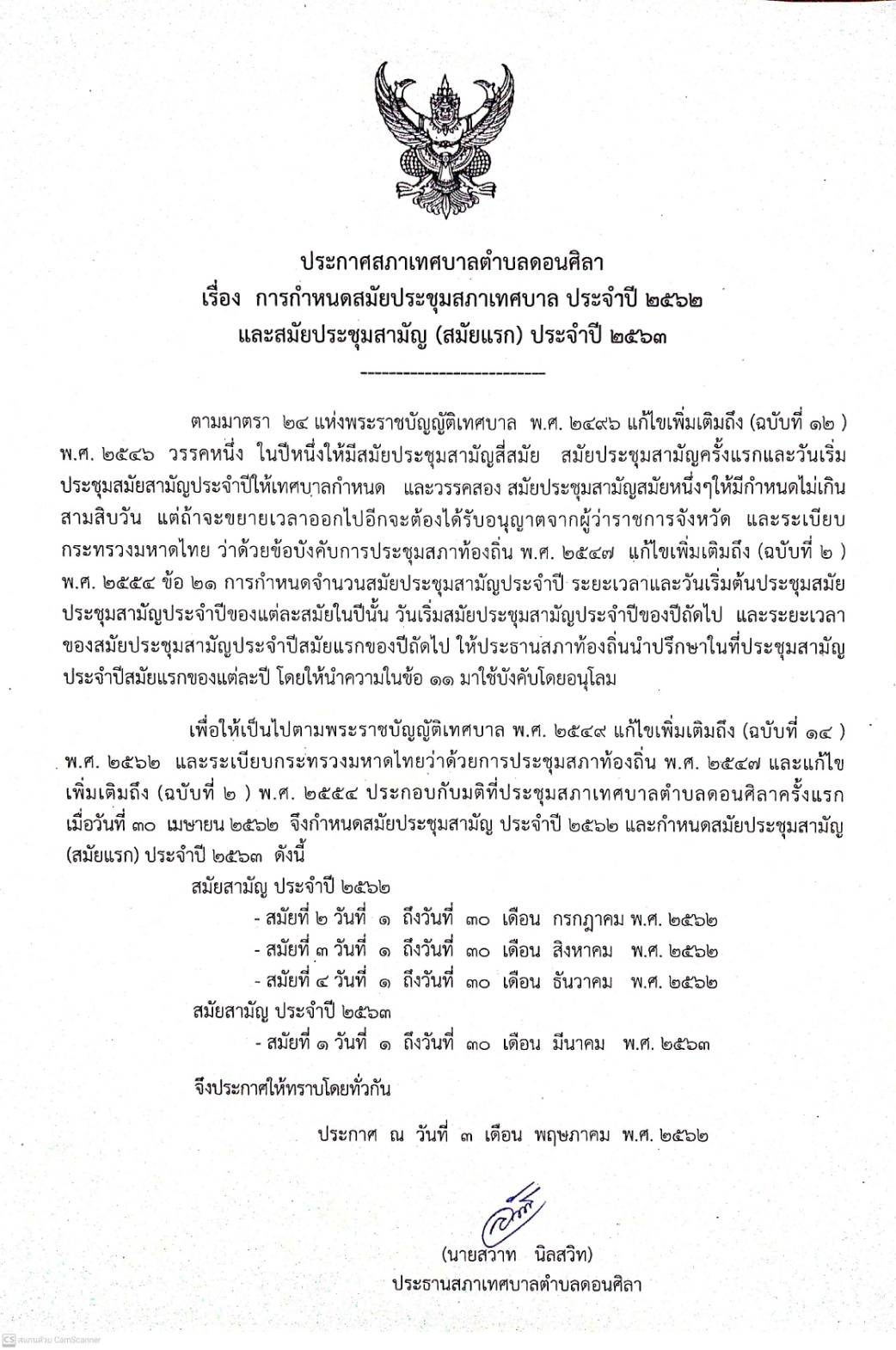 ประกาศกำหนดสมัยประชุมสภาเทศบาลตำบลดอนศิลา ประจำปี พ.ศ. 2562