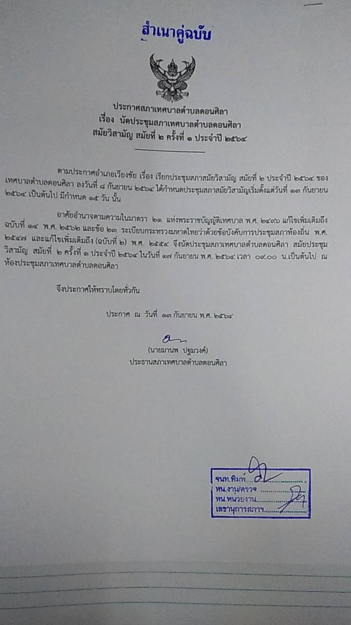 ประกาศสภาเทศบาลตำบลดอนศิลา เรื่อง นัดประชุมสภาเทศบาลตำบลดอนศิลา สมัยวิสามัญ สมัยที่ 2 คร้ังที่ 1 ประจำปี 2564
