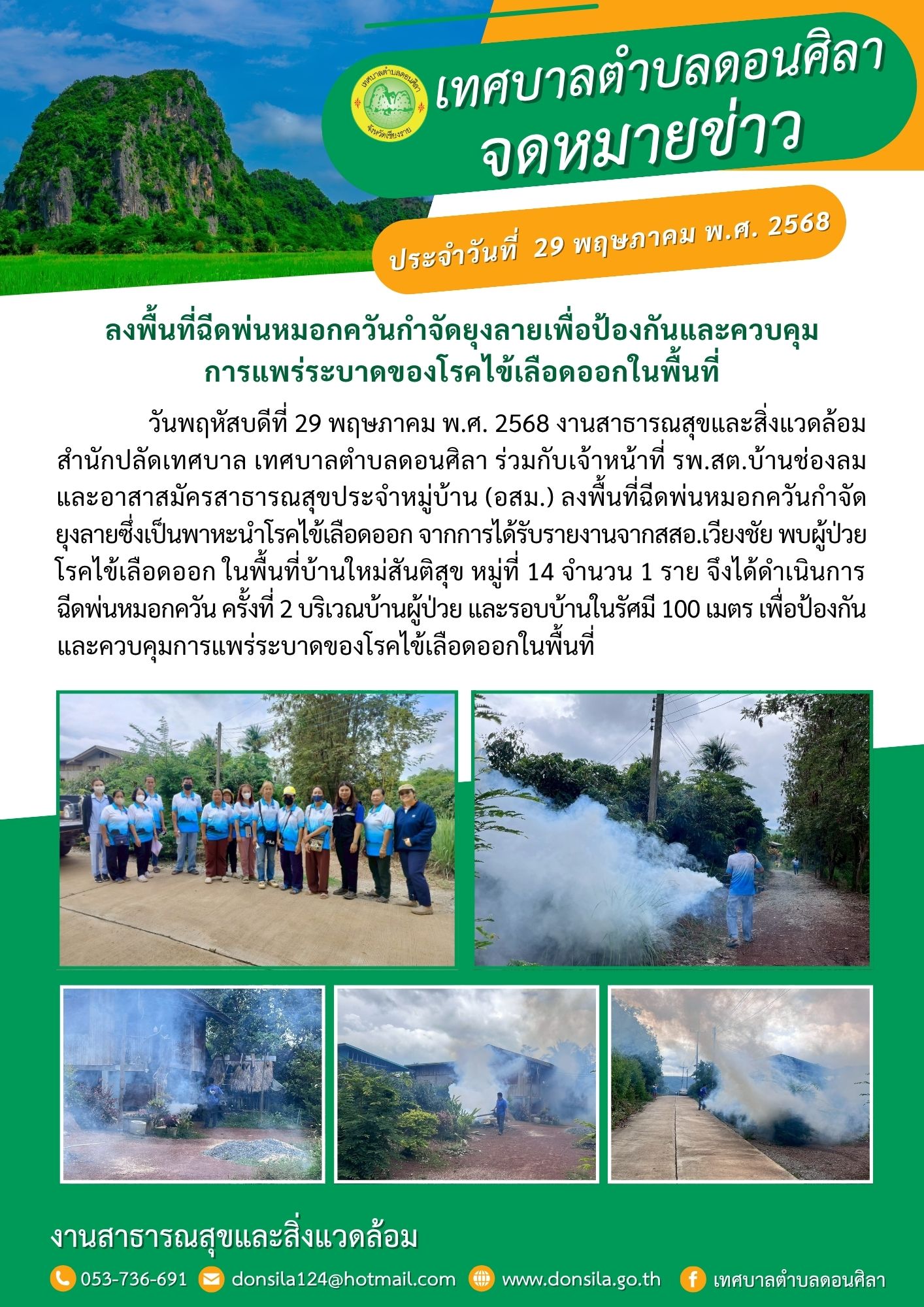 ลงพื้นที่ฉีดพ่นหมอกควันกำจัดยุงลายเพื่อป้องกันและควบคุมการแพร่ระบาดของโรคไข้เลือดออกในพื้นที่
