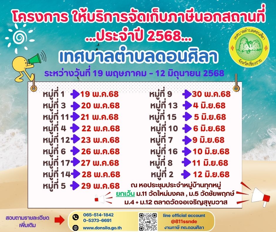 หมู่ที่ 1 - หมู่ ที่ 17 ต.ดอนศิลา อ.เวียงชัย จ.เชียงราย ระหว่างวันที่ 19 พฤษภาคม 2568 - 12 มิถุนายน 2568 เวลา 09.00 น. - 12.00 น.