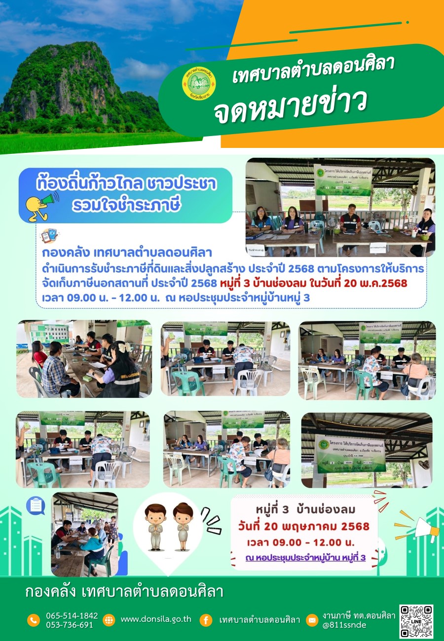 ประชาสัมพันธ์..โครงการ ให้บริการจัดเก็บภาษีนอกสถานที่ ประจำปี 2568 หมู่ที่ 3 บ้านช่องลม ต.ดอนศิลา อ.เวียงชัย จ.เชียงราย ในวันที่ 20 พ.ค. 2568 เวลา 09.00-12.00น. ณ หอประชุมประจำหมู่บ้าน หมู่ที่ 3