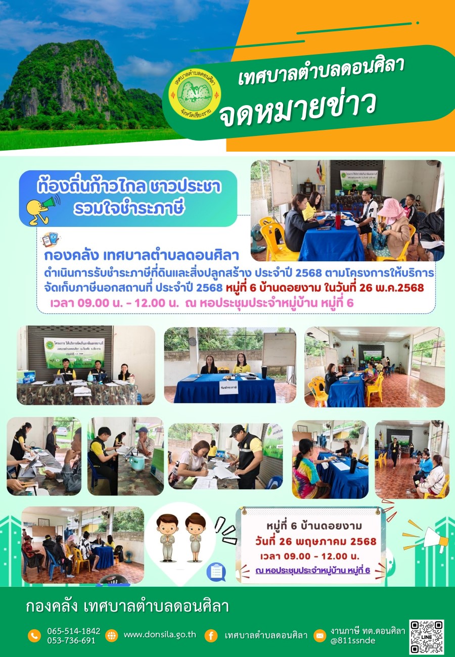 ประชาสัมพันธ์..โครงการ ให้บริการจัดเก็บภาษีนอกสถานที่ ประจำปี 2568 หมู่ที่ 6 บ้านดอยงาม ต.ดอนศิลา อ.เวียงชัย จ.เชียงราย ในวันที่ 26 พ.ค. 2568 เวลา 09.00-12.00น. ณ หอประชุมประจำหมู่บ้านหมู่ที่ 6