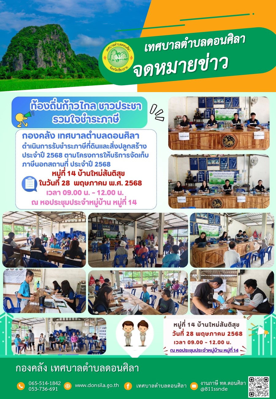 ประชาสัมพันธ์..โครงการ ให้บริการจัดเก็บภาษีนอกสถานที่ ประจำปี 2568 หมู่ที่ 14 บ้านใหม่สันติสุข ต.ดอนศิลา อ.เวียงชัย จ.เชียงราย ในวันที่ 28 พ.ค. 2568 เวลา 09.00-12.00น. ณ หอประชุมประจำหมู่บ้านหมู่ที่ 14