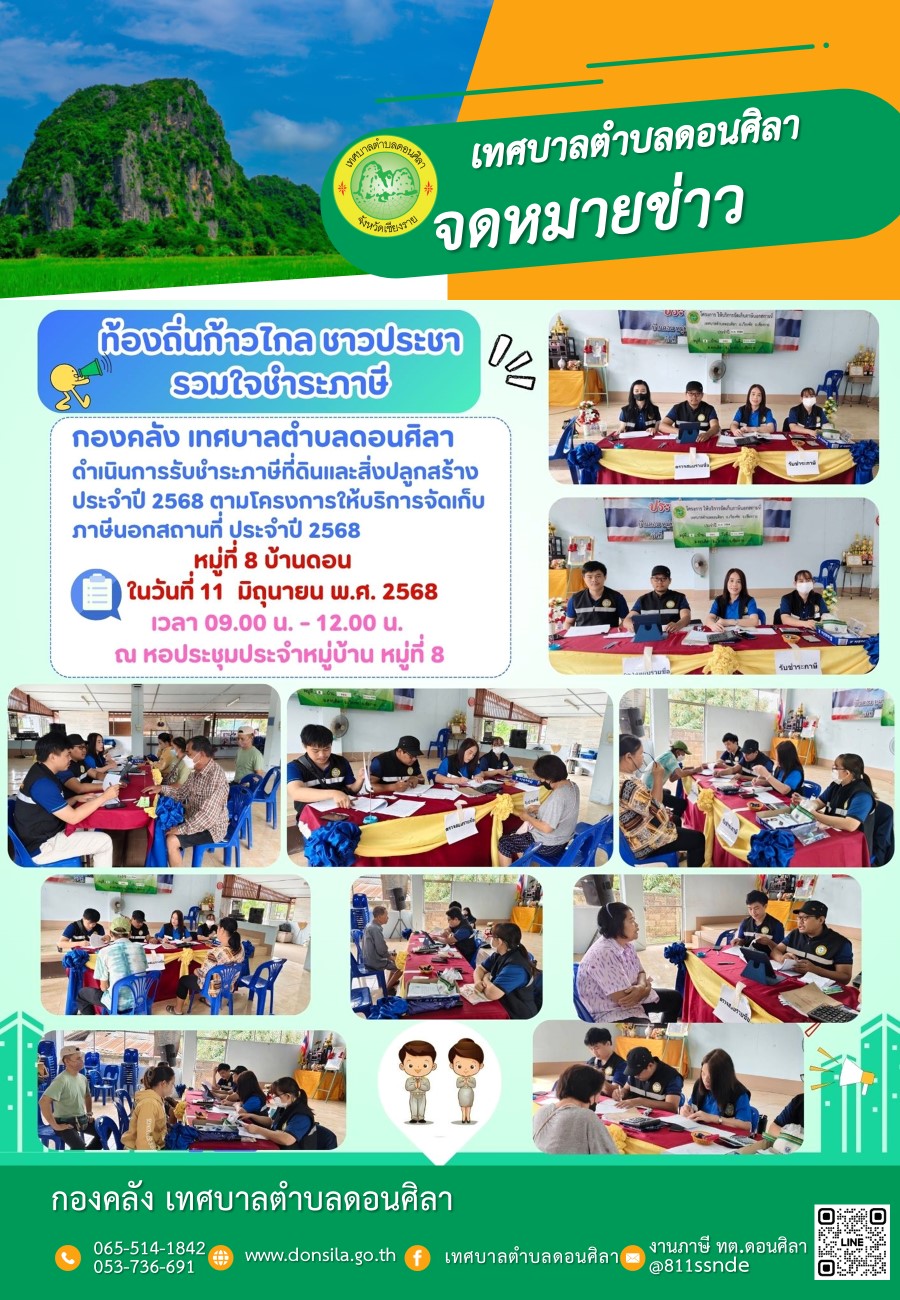 ประชาสัมพันธ์..โครงการ ให้บริการจัดเก็บภาษีนอกสถานที่ ประจำปี 2568 หมู่ที่ 8 บ้านดอนเหนือ ต.ดอนศิลา อ.เวียงชัย จ.เชียงราย ในวันที่ 11 มิ.ย. 2568 เวลา 09.00-12.00น. ณ หอประชุมประจำหมู่บ้านหมู่ที่ 8