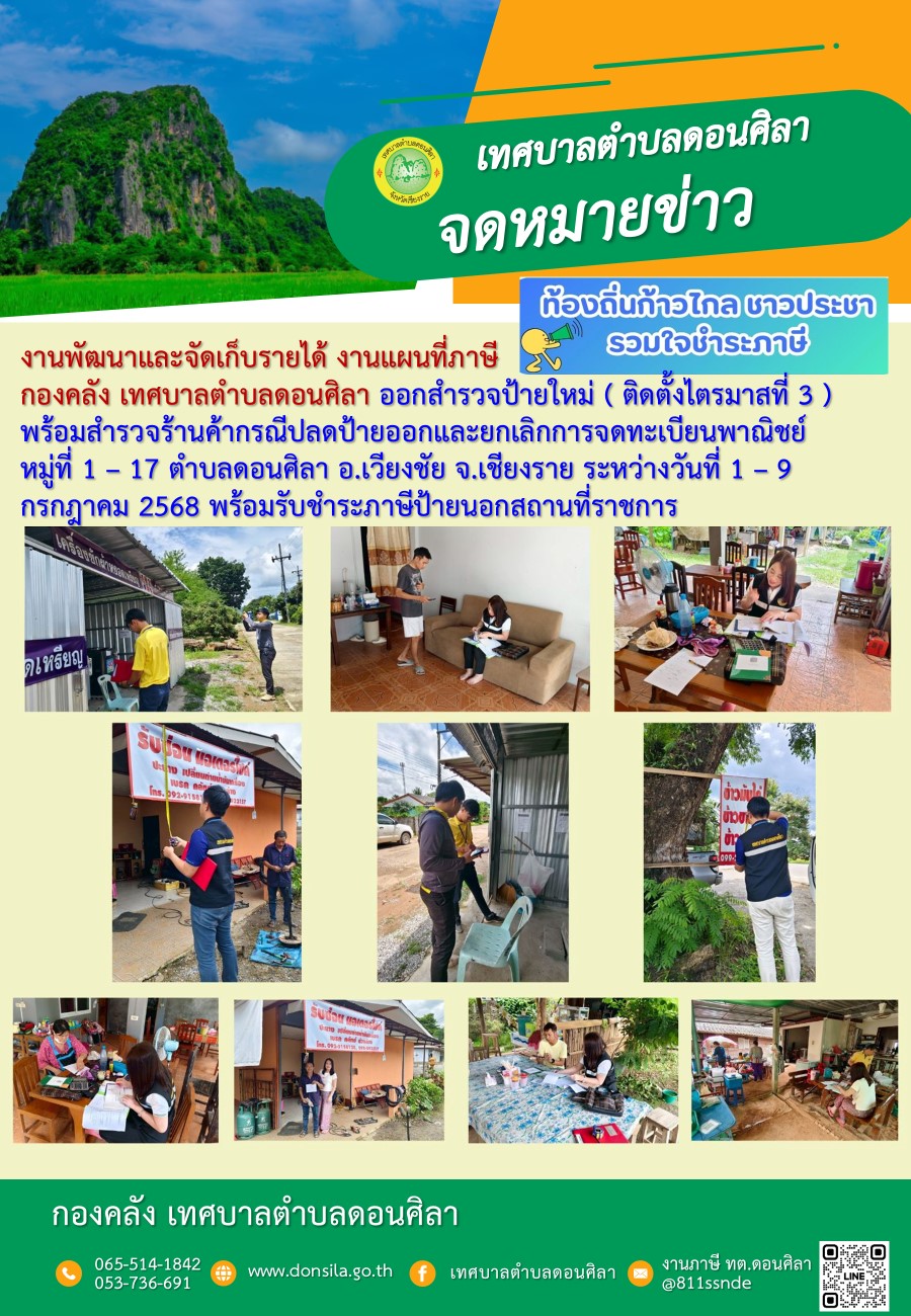 งานพัฒนาและจัดเก็บรายได้ งานแผนที่ภาษี กองคลัง เทศบาลตำบลดอนศิลา ออกสำรวจป้ายใหม่ ( ติดตั้งไตรมาสที่ 3 ) พร้อมสำรวจร้านค้ากรณีปลดป้ายออกและยกเลิกการจดทะเบียนพาณิชย์ หมู่ที่ 1 – 17 ตำบลดอนศิลา อ.เวียงชัย จ.เชียงราย ระหว่างวันที่ 1 – 9 กรกฎาคม 2568 พร้อมรับชำระภาษีป้ายนอกสถานที่ราชการ