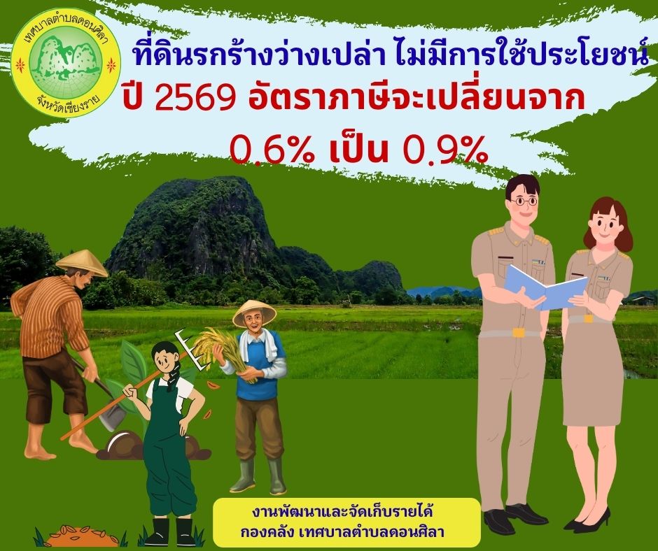 หากปล่อยที่ดิน ทิ้งร้างว่างเปล่า ติดต่อกัน 3 ปี จะถูกเก็บภาษีเพิ่ม 0.3% ในปีที่ 4 และจะเพิ่มขึ้นอีก 0.3% ทุก ๆ 3 ปีหากยังไม่มีการนำมาทำประโยชน์ แต่ สูงสุดไม่เกิน 3% .......หากมีการ เปลี่ยนแปลงการใช้ที่ดินให้รีบ แจ้งเจ้าหน้าที่ เพื่อปรับปรุงข้อมูลให้ถูกต้อง ก่อนการประเมินภาษีที่ดินและสิ่งปลูกสร้างในปี 2569 **********ปี2569อัตราภาษีจะเปลี่ยนจาก 0.6% เป็น 0.9%***** #พัฒนาและจัดเก็บรายได้ กองคลัง เทศบาลตำบลดอนศิลา