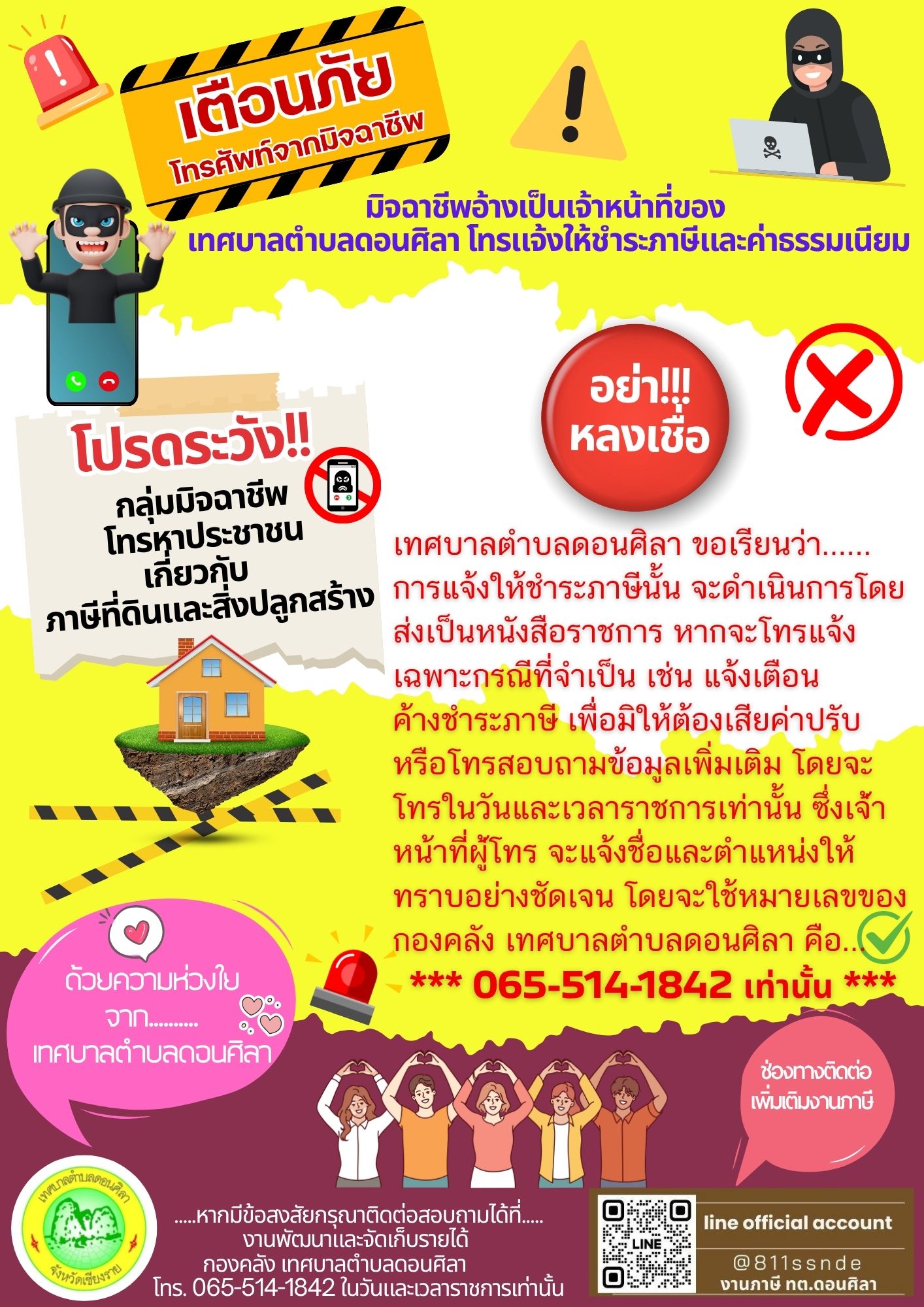 ประชาสัมพันธ์แจ้งเตือน **มิจฉาชีพอ้างเป็นเจ้าหน้าที่ โทรแจ้งให้โอนเงินชำระค่าภาษีที่ดินและสิ่งปลูกสร้าง** ♦เนื่องด้วยในช่วงระยะนี้ ได้ปรากฏมีมิจฉาชีพอ้างว่าเป็นเจ้าหน้าที่ของของเทศบาลตำบลดอนศิลา โทรศัพท์แจ้งให้โอนเงินชำระค่าภาษีหรือค่าธรรมเนียมต่างๆ นั้น ขอโปรดให้ระมัดระวังอย่าได้หลงเชื่อ อาจทำให้เกิดความเสียหายและสูญเสียทรัพย์ได้ *** ด้วยความห่วงใยจาก งานพัฒนาและจัดเก็บรายได้ กองคลัง เทศบาลตำบลดอนศิลา*****