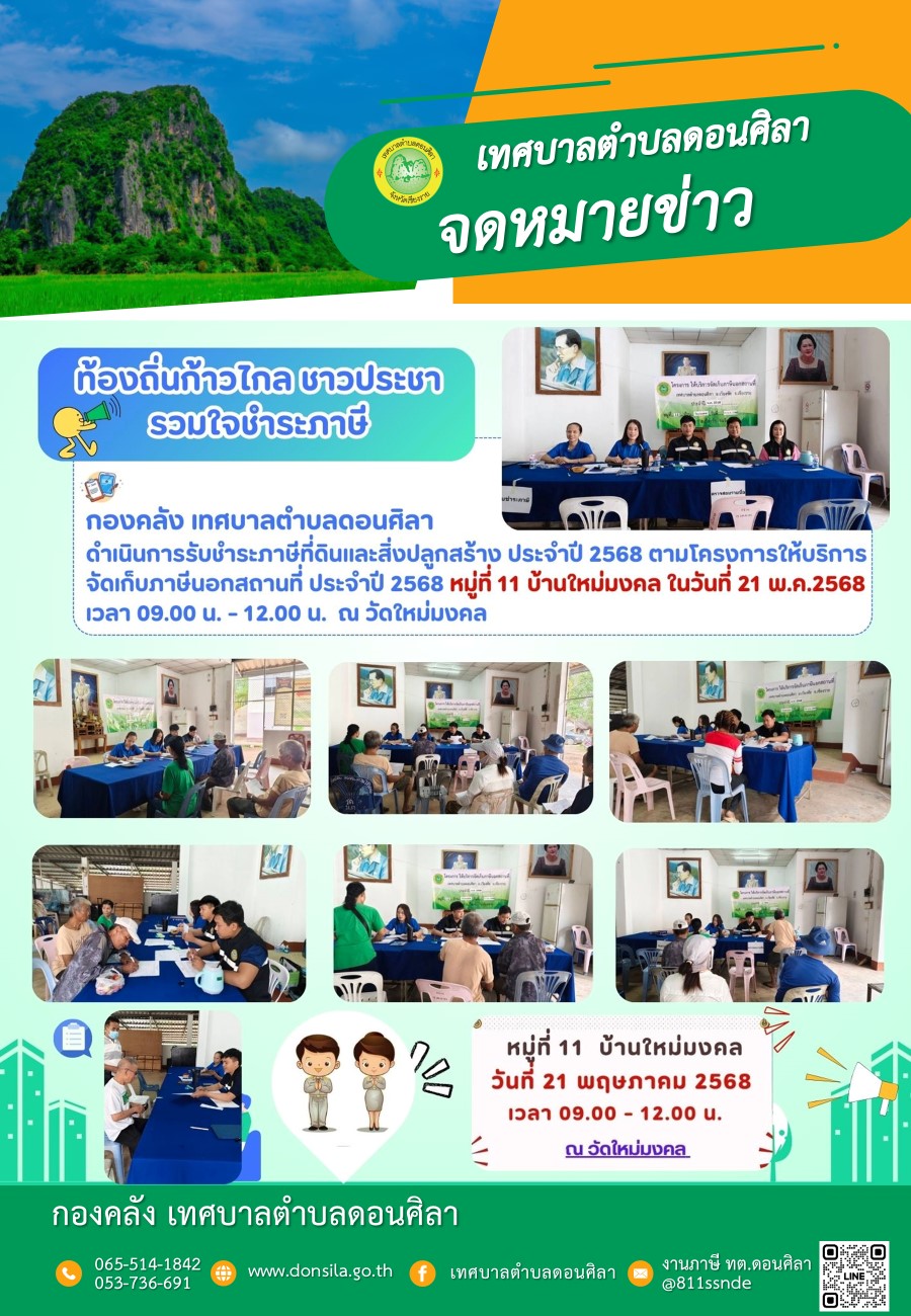 ประชาสัมพันธ์..โครงการ ให้บริการจัดเก็บภาษีนอกสถานที่ ประจำปี 2568 หมู่ที่ 11 บ้านใหม่มงคล ต.ดอนศิลา อ.เวียงชัย จ.เชียงราย ในวันที่ 21 พ.ค. 2568 เวลา 09.00-12.00น. ณ หอประชุมวัดใหม่มงคล