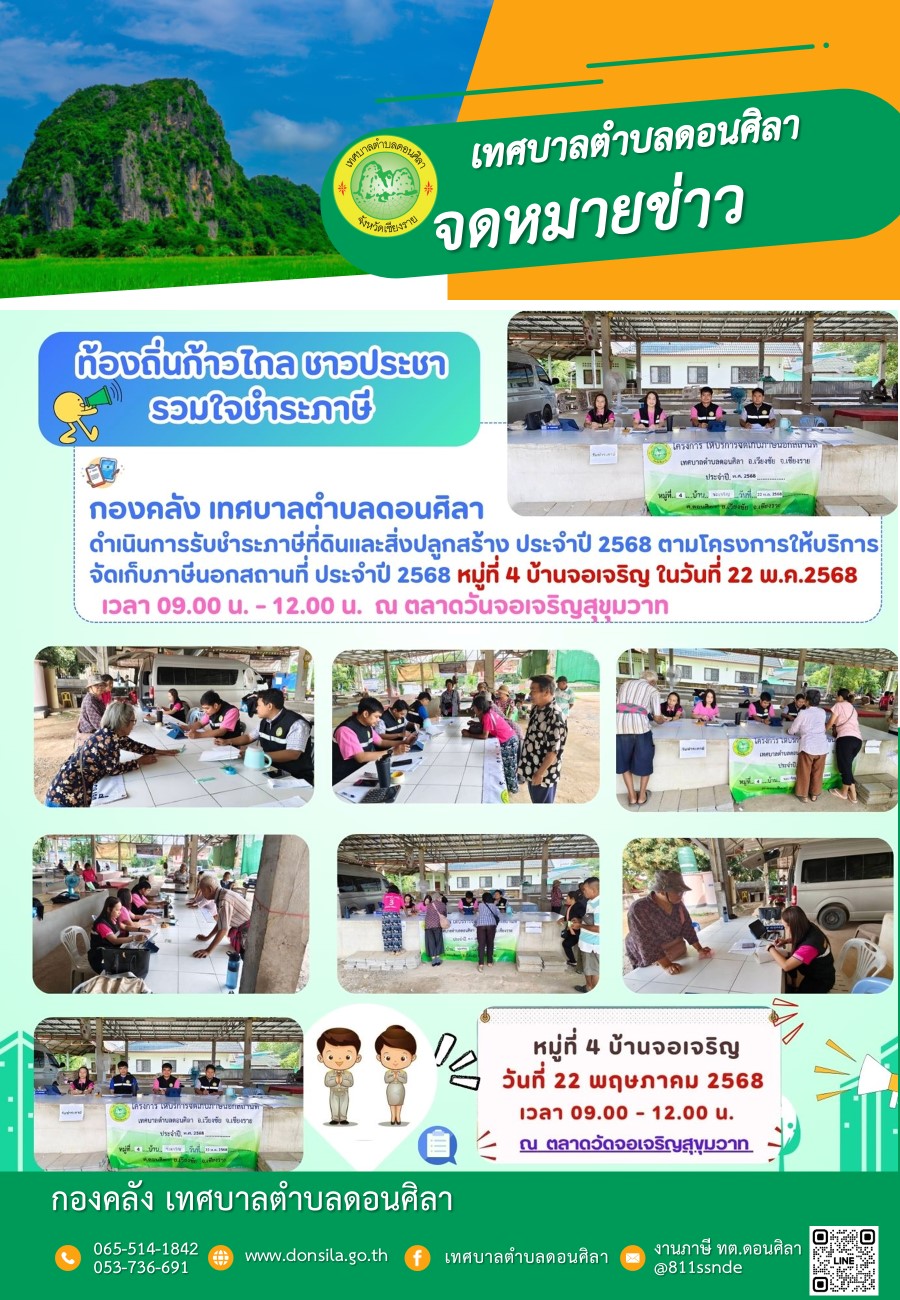 ประชาสัมพันธ์..โครงการ ให้บริการจัดเก็บภาษีนอกสถานที่ ประจำปี 2568 หมู่ที่ 4 บ้านจอเจริญ ต.ดอนศิลา อ.เวียงชัย จ.เชียงราย ในวันที่ 22 พ.ค. 2568 เวลา 09.00-12.00น. ณ ตลาดวัดจอเจริญสุขุมวาท