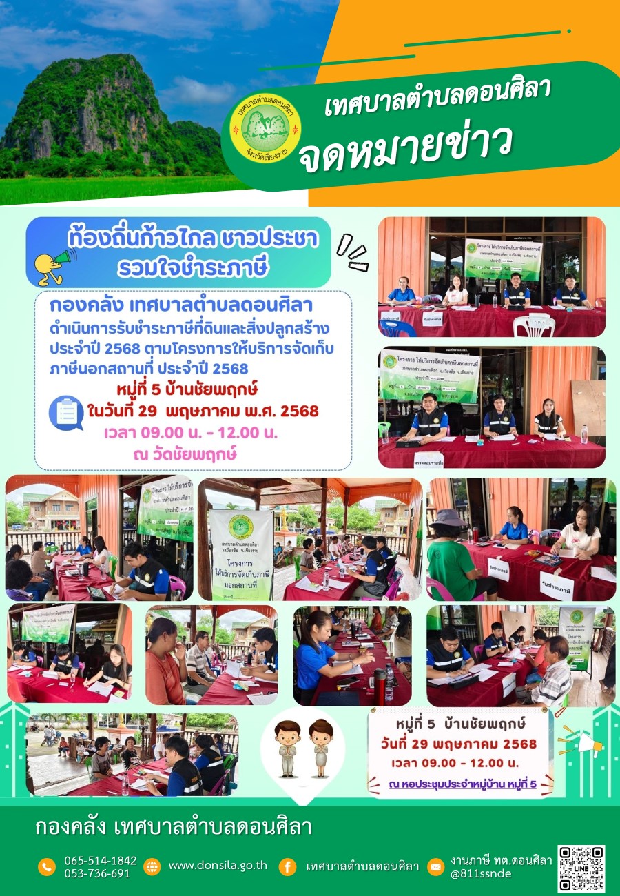ประชาสัมพันธ์..โครงการ ให้บริการจัดเก็บภาษีนอกสถานที่ ประจำปี 2568 หมู่ที่ 5 บ้านชัยพฤกษ์ ต.ดอนศิลา อ.เวียงชัย จ.เชียงราย ในวันที่ 29 พ.ค. 2568 เวลา 09.00-12.00น. ณ วัดชัยพฤกษ์ หมู่ที่ 5