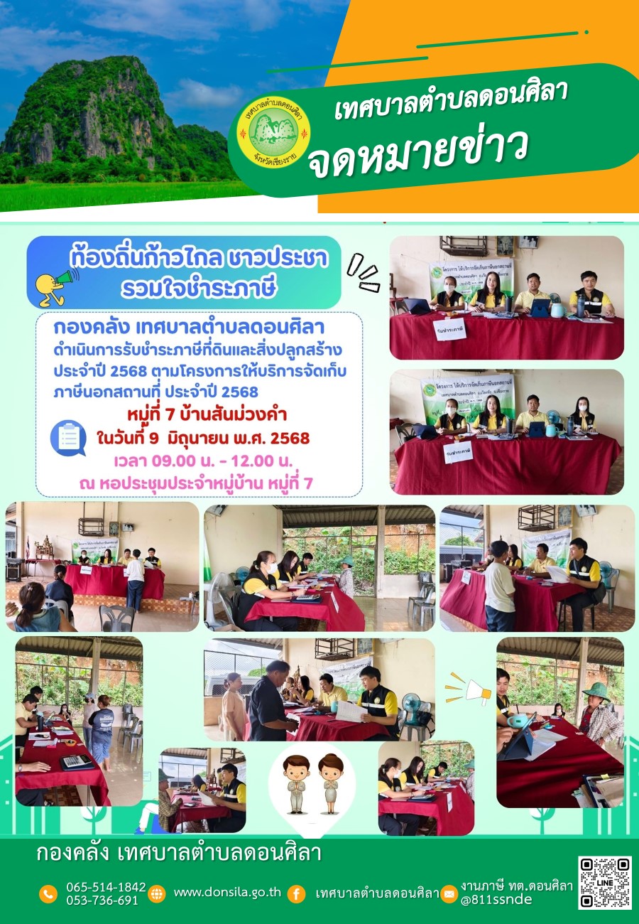 ประชาสัมพันธ์..โครงการ ให้บริการจัดเก็บภาษีนอกสถานที่ ประจำปี 2568 หมู่ที่ 7 บ้านสันม่วงคำ ต.ดอนศิลา อ.เวียงชัย จ.เชียงราย ในวันที่ 9 มิ.ย. 2568 เวลา 09.00-12.00น. ณ หอประชุมประจำหมู่บ้านหมู่ที่ 7