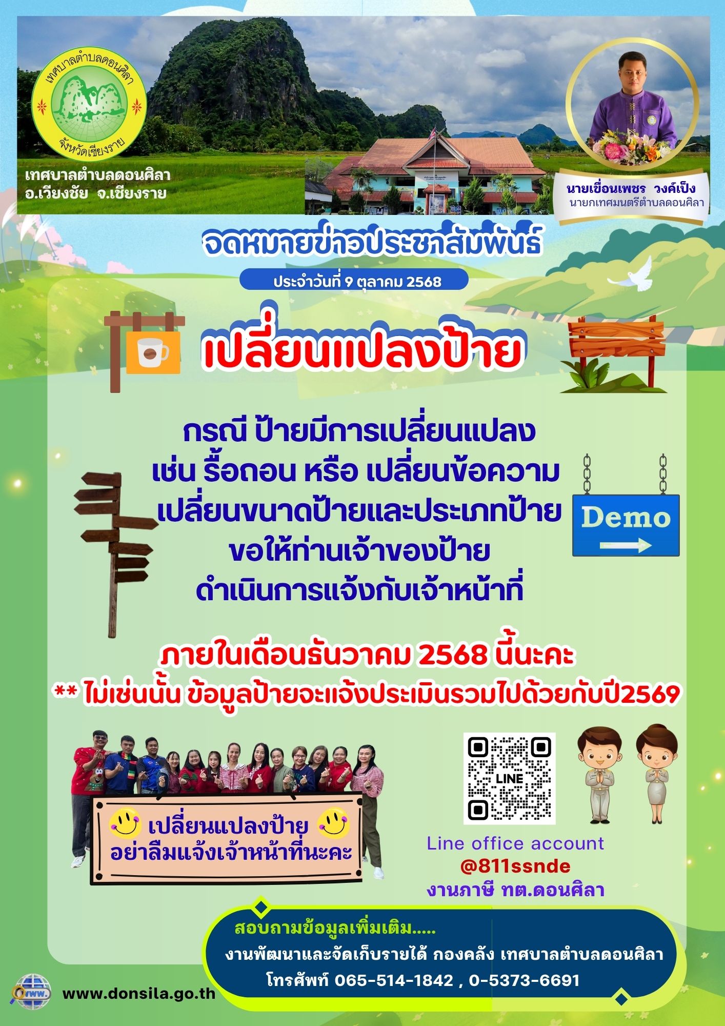ป้ายมีการเปลี่ยนแปลง เช่น รื้อถอน หรือ เปลี่ยนข้อความ เปลี่ยนขนาดป้าย และประเภทป้าย ขอให้ท่านเจ้าของป้ายดำเนินการแจ้งกับเจ้าหน้าที่ภายในเดือนธันวาคม 2568 นี้นะคะ #พัฒนาและจัดเก็บรายได้ กองคลัง เทศบาลตำบลดอนศิลา