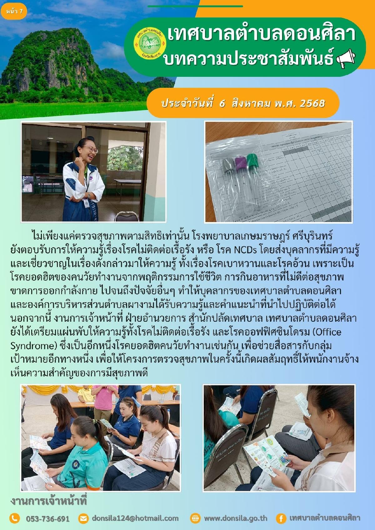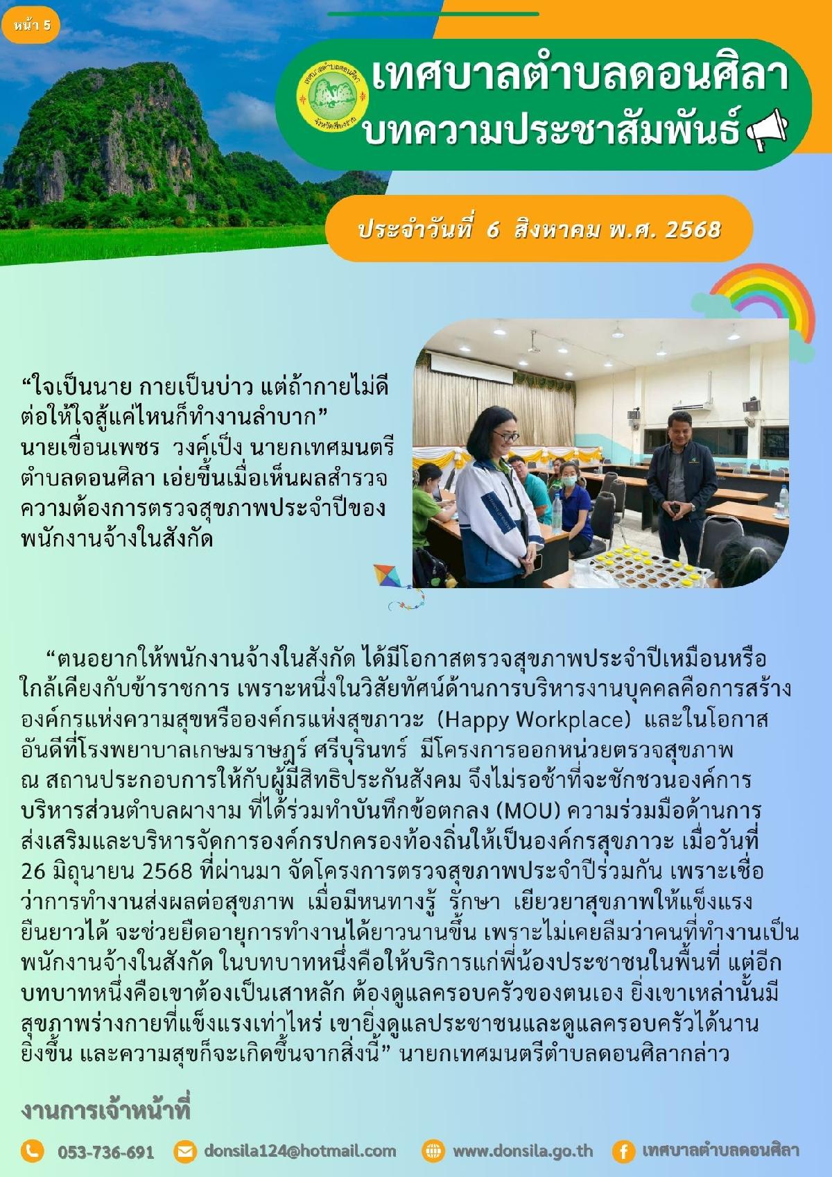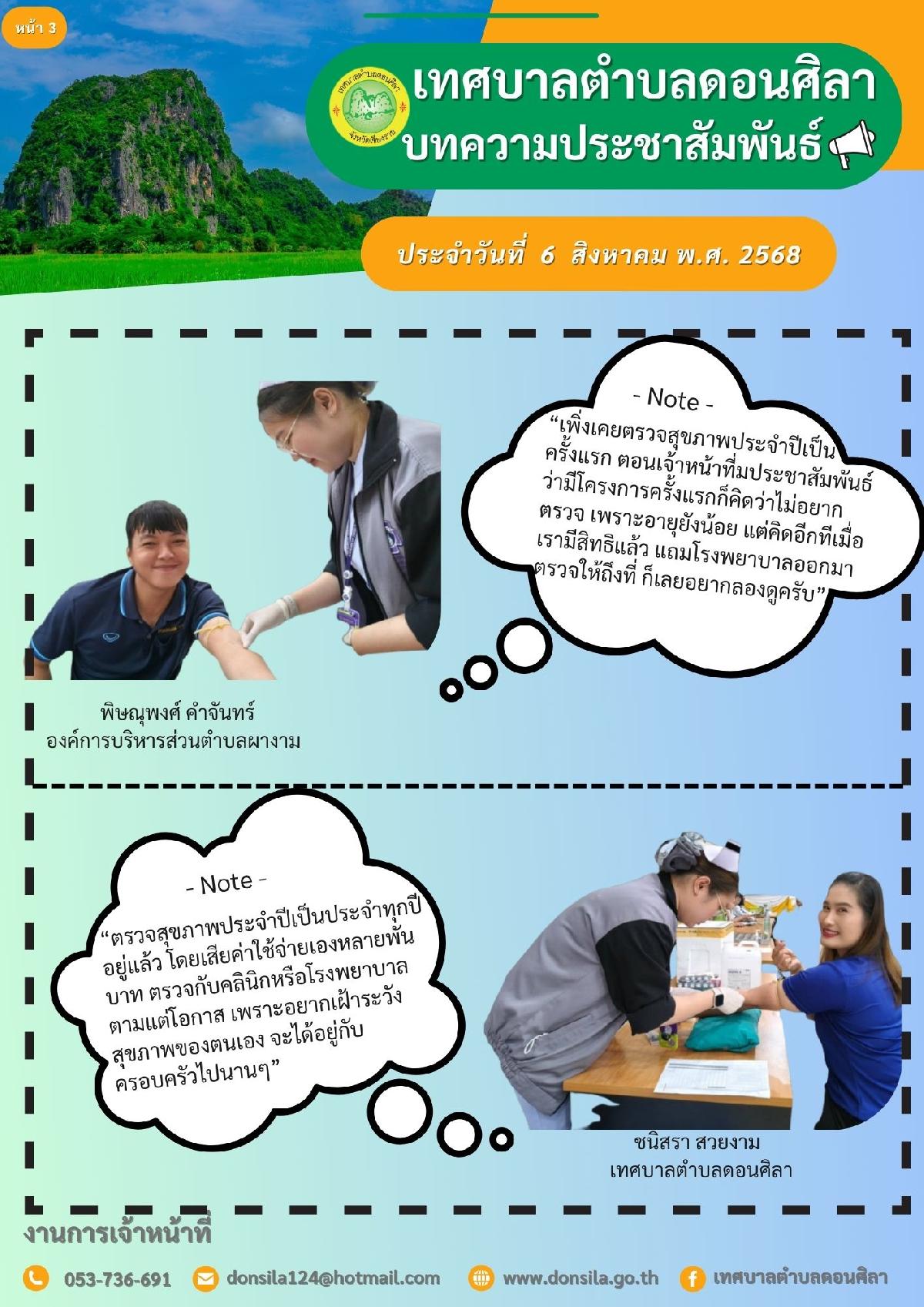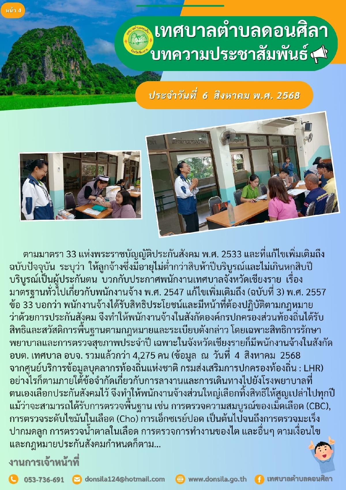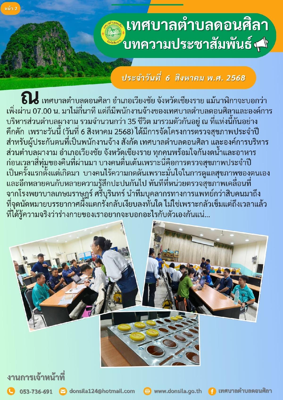 โครงการตรวจสุขภาพประจำปี สำหรับผู้ประกันตนที่เป็นพนักงานจ้าง สังกัด เทศบาลตำบลดอนศิลา และองค์การบริหารส่วนตำบลผางาม อำเภอเวียงชัย จังหวัดเชียงราย